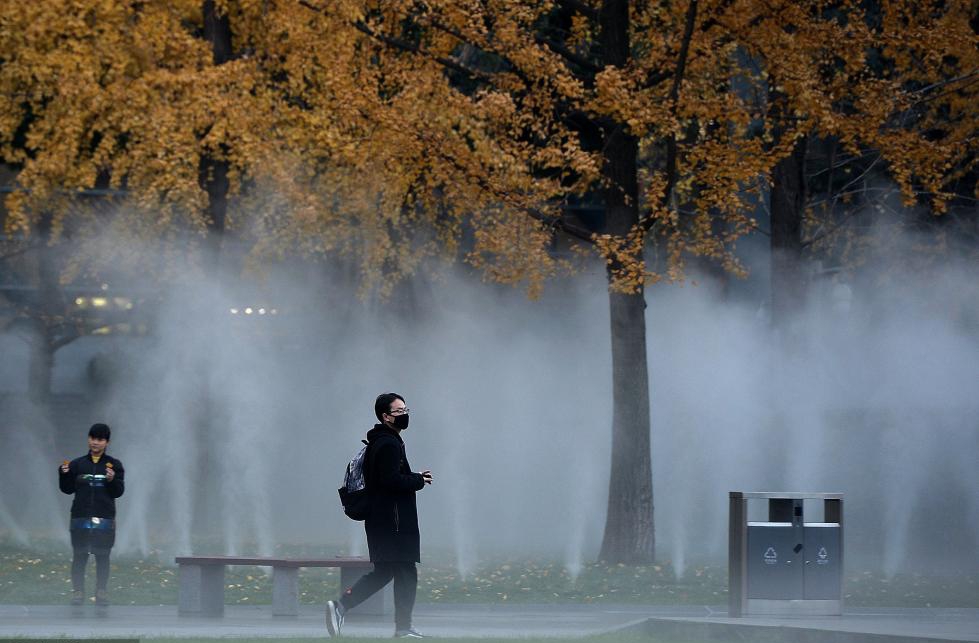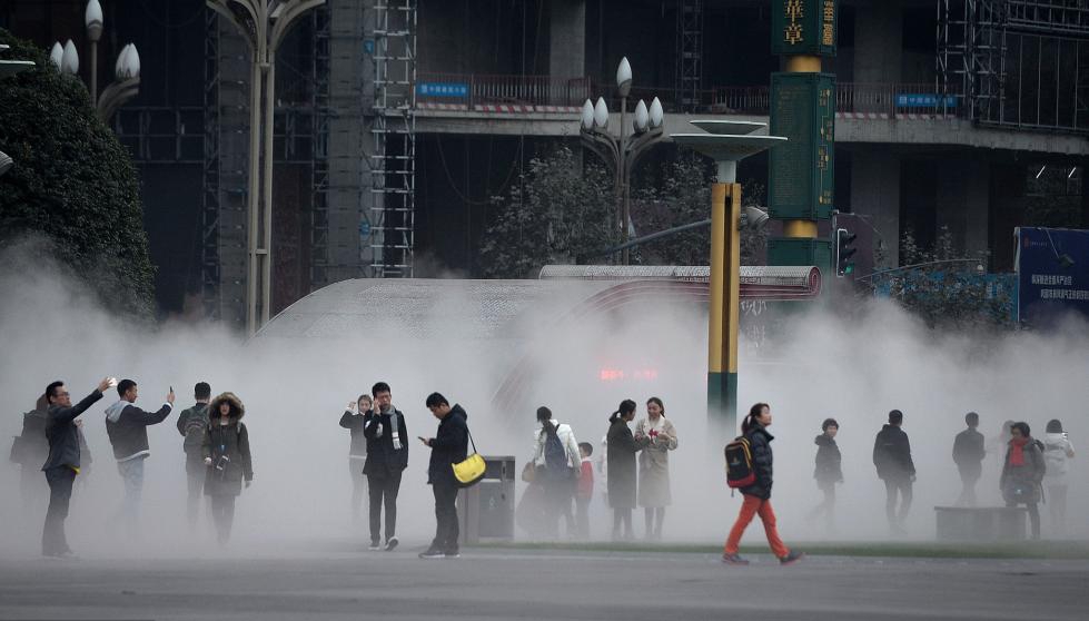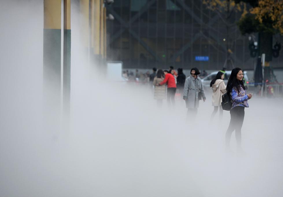 2017年12月23日,成都。天府廣場(chǎng)西側(cè)和南側(cè)有了新變化——上午10點(diǎn),綠油油的草坪上空開(kāi)始籠罩著層層白色霧氣,仿佛置身于仙境一般。走近一點(diǎn),還有水霧襲來(lái),平添一分清新和涼意。