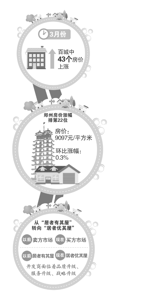 中國指數(shù)研究院昨日發(fā)布的百城房價(jià)指數(shù)顯示,3月份,100個(gè)城市中有43個(gè)房價(jià)上漲,全國房價(jià)環(huán)比整體跌幅收窄,微跌0.15%,同比跌幅繼續(xù)擴(kuò)大,下跌4.35%。其中,鄭州3月份新建商住房均價(jià)為9097元/平方米,環(huán)比上漲0.3%,漲幅在全國排到第22位。