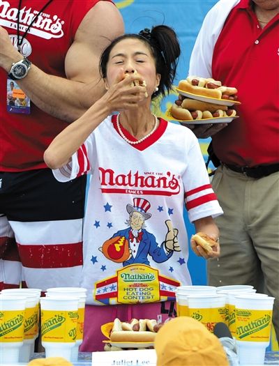 7月4日,紐約舉行吃熱狗大賽,參賽選手正大嚼熱狗。吃熱狗競(jìng)賽是紐約康尼島慶祝獨(dú)立日的一項(xiàng)傳統(tǒng)趣味活動(dòng)。新華社發(fā)