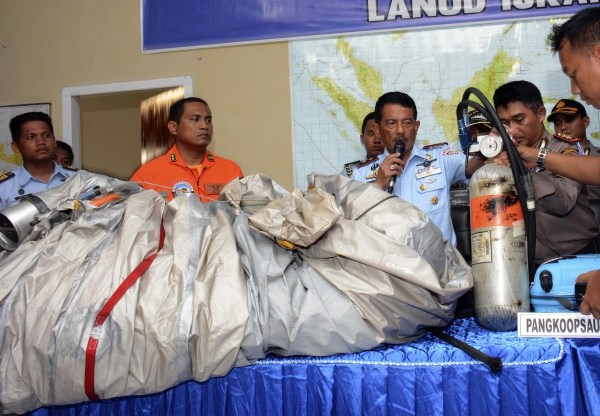 當(dāng)?shù)貢r(shí)間2014年12月30日,印尼龐卡蘭布翁,雅加達(dá)空軍基地指揮官M(fèi)arshal Dwi Putranto正在展示從現(xiàn)場打撈上來的一個(gè)緊急滑梯和乘客的行李箱。