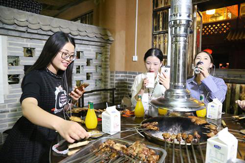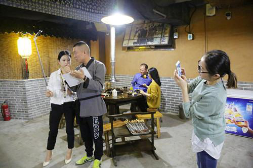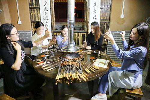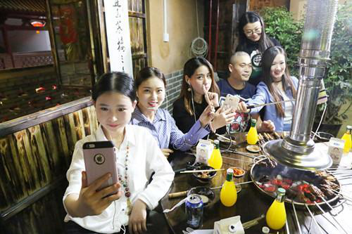 在岳家水滸烤肉店里,主播們剛剛坐下直播,就吸引來了在店里消費(fèi)的其他顧客,肉都顧不上吃了,求合影,求關(guān)注……