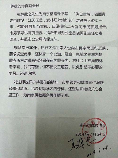 7月24日,傳真法師收到一封南京市佛教協(xié)會的回函。回函稱,除了傳真法師報案外,林散之家人也向市民宗局反映,要求調(diào)查此事,還林家一個公道。