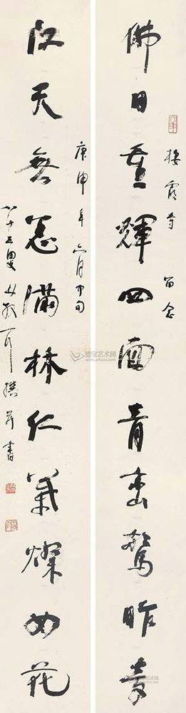 北京匡時國際拍賣有限公司描述稱,林散之先生的這副作品作于1980年,為棲霞寺所書,林氏時年83歲,已是人書俱老的時期……林散之筆下的線條曲中有直,直中寓曲,剛中有柔,柔中寓剛,從而達(dá)到一種清逸虛妙之境。林散之的草書風(fēng)格雖然欹正相生,但往往會把其中的變化復(fù)歸平正,偏能得中,奇而能穩(wěn),故顯得格外的老成與持重。由于林散之的藝術(shù)思想受佛家影響較深,而此為“三論宗”的發(fā)源地棲霞寺所書,更能見其書寫之虔誠。