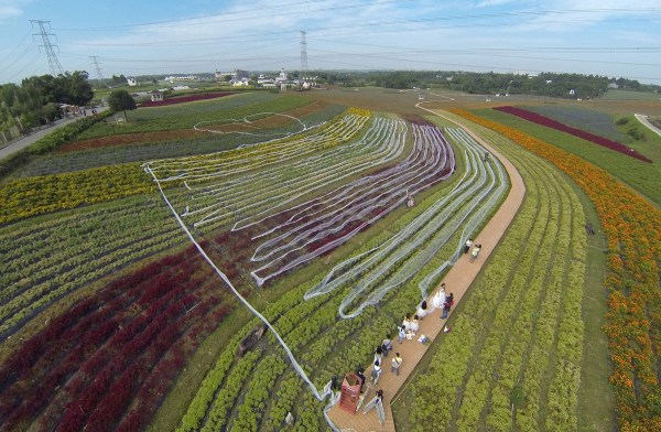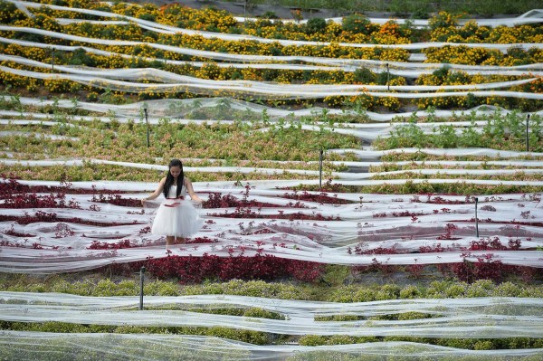 9月24日,成都一景點(diǎn)內(nèi)現(xiàn)4100米長的婚紗,該婚紗耗時(shí)一個月制成,大約花費(fèi)4萬元。成都商報(bào)/東方IC