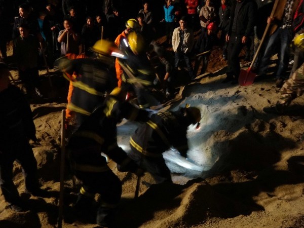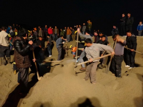 圖為消防官兵和附近居民幫忙挖沙救人。