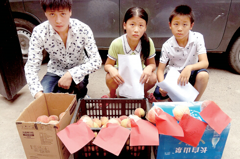 12日9時(shí)許,西三環(huán)建設(shè)路口東南角,一箱箱桃子從面包車上搬下,陳國(guó)西和兒子陳揚(yáng)細(xì)心地將“媽媽兒子想你”6張紅紙貼在桃子上。