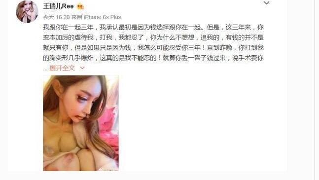 近日,曾有“第一網紅”之稱的嫩模王瑞兒在微博發(fā)文自曝被男友嚴重家暴,她大膽曬出右眼紅腫不堪、嘴角流血的“被虐打”慘狀,并稱胸被打到“變形幾乎爆炸”,和劉梓晨神似龍鳳胎。據稱,王瑞兒整容過的假胸價值高達百萬。王瑞兒自稱與男友交往三年,大方承認最初在一起是貪圖對方“有錢”,三年來遭受了無休止的虐待和毆打,此次更是變本加厲險些將胸“打爆”,這才怒而提出分手:“請你滾蛋,從此遠離我的生活……如果再跟你在一起,我將萬劫不復!”