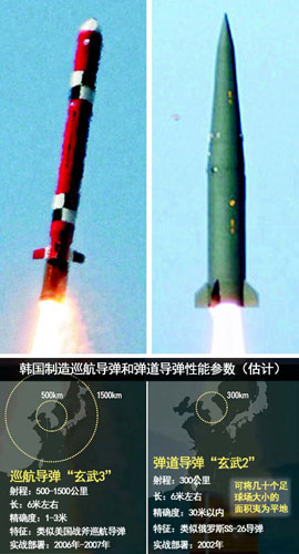 據(jù)韓國《朝鮮日報(bào)》20日報(bào)道,韓國19日首次對外公開了自制巡航導(dǎo)彈和彈道導(dǎo)彈。巡航導(dǎo)彈“玄武-3”最大射程1500公里,可精確打擊朝鮮全境核與導(dǎo)彈基地等主要戰(zhàn)略設(shè)施;彈道導(dǎo)彈“玄武-2”射程300公里,一發(fā)可將幾十個(gè)足球場大的面積夷為平地。