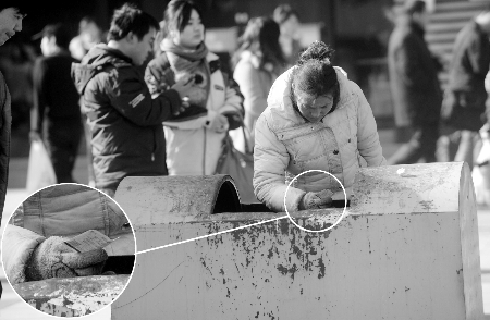 昨日上午11時許,在鄭州火車站北出站口旁,一名穿藍(lán)色棉襖的女子一直站在垃圾桶旁邊,手拎著裝有塑料瓶的黑色袋子,見人扔?xùn)|西就盯著人家的手。