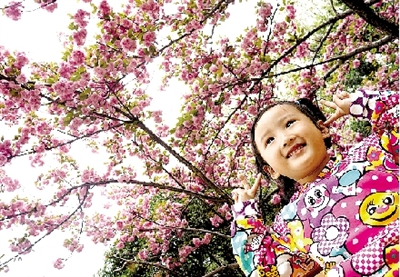 昨天,人民公園,小女孩在櫻花樹下擺出可愛的造型拍照。 記者 馬健 圖