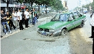 路南側(cè)快車道與慢車道中間,一輛出租車頭部栽到剛鋪上的稀水泥路面上。