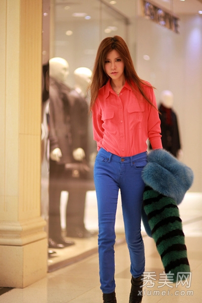 撞色搭配時尚搶眼,特別有視覺沖擊力,紅色簡約襯衫搭配藍(lán)色小腳褲,鮮明的色彩對比,想不成為焦點都難呢。
