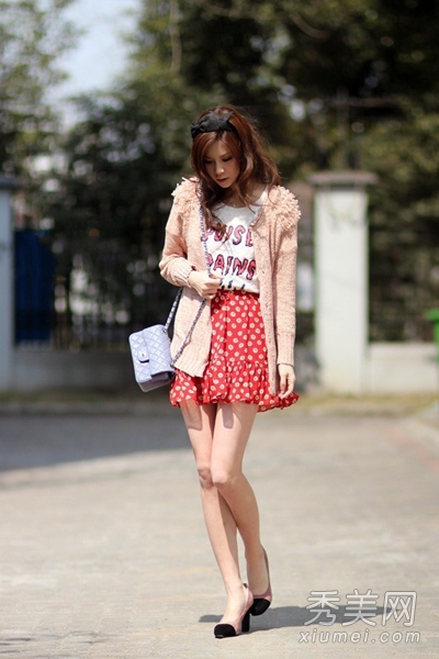 淺粉色立體花針織開衫,很清甜可愛的風(fēng)格,穿在身上有種溫婉的氣息,內(nèi)搭白色T恤下穿白色波點紅色短裙,拼接高跟鞋,優(yōu)雅魅力十足。
