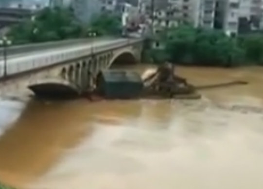 實(shí)拍砂船遭洪水沖擊撞上大橋