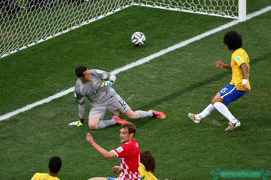 北京時間6月13日凌晨4時,2014年巴西世界杯揭幕戰(zhàn)在圣保羅競技場(科林蒂安競技場、伊塔蓋拉球場)展開,東道主巴西3-1逆轉(zhuǎn)東歐勁旅克羅地亞。第10分鐘,奧利奇左路傳中,馬塞洛不慎自擺烏龍。第29分鐘,內(nèi)馬爾依靠個人能力扳平比分。第69分鐘,弗雷德制造爭議點(diǎn)球,內(nèi)馬爾將球冷靜罰入,反超比分。第91分鐘,奧斯卡反擊中捅射再下一城。圖為馬塞洛烏龍進(jìn)球瞬間。