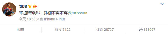 2015年3月30日,鄧超發(fā)表微博稱:“鄧超智障多年,孫儷不離不棄?!标P心孫儷和鄧超二人的網友們瞬間圍觀。網友們徹底被鄧超這個段子手所打敗了:“說的好有道理,我竟無言以對?!?/p>