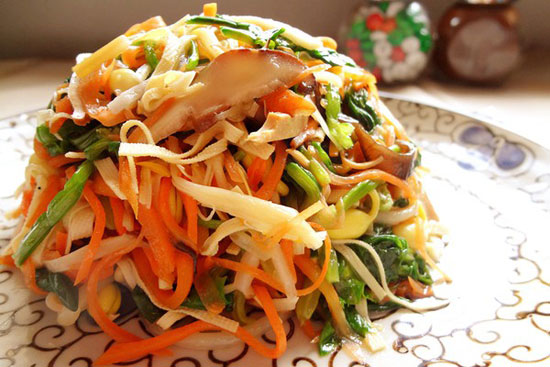《金陵歲時(shí)記》記載了南京人除夕的“十景菜”(也叫什錦菜),人們以醬姜、黃瓜、胡蘿卜、金針菇、木耳、冬筍、白芹、醬油干、百葉、面筋十種,細(xì)切成絲,以油炒之,這就是所謂的“十景”。這些菜都有著美好的寓意:黃瓜,象征瓜瓜連連、子孫蔓延;冬筍,象征雨后春筍節(jié)節(jié)高;百葉,象征百依百順樣樣順,都是要討個(gè)吉利的口彩。現(xiàn)在的什錦菜已經(jīng)不止10種了,甚至多達(dá)16-18種,增加了藕,象征路路通;黃豆芽,象征如意;薺菜,象征聚財(cái);馬齒莧,南京又稱(chēng)安樂(lè)菜,象征平安喜樂(lè)。