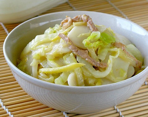 這白菜肉絲炒年糕大概每個上海煮婦都做上過幾回吧,天冷的時候,大棵的白菜囤起來,切兩根年糕,撒點肉絲,調(diào)味簡簡單單,少許鹽和醬油點個味就行。說是炒年糕,其實是半湯的,有少許濃稠的湯汁在里頭,年糕軟糯,吸收著大白菜和肉絲的湯汁,吃一小碗就暖心暖胃。