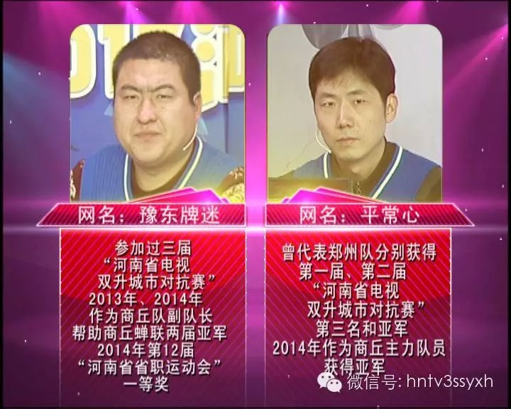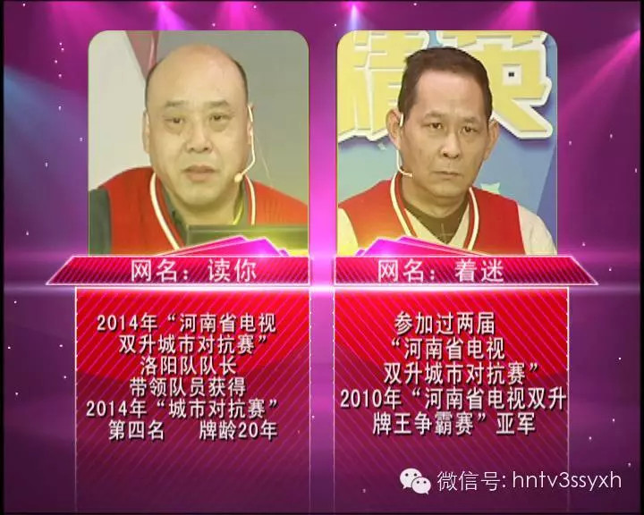 今晚將要比拼的是精英賽下半?yún)^(qū)第1輪的第4場比賽,說到選手陣容,可以說是實(shí)至名歸的精英牌手?!白x你”和“著迷”都來自洛陽,“讀你”牌齡更是長達(dá)20年,在2014年城市對抗賽任洛陽隊(duì)隊(duì)長,并帶領(lǐng)隊(duì)員獲得2014年城市對抗賽第四名的好成績?!爸浴痹@得2010年河南省電視雙升牌王爭霸賽亞軍,曾參加過兩屆城市對抗賽,也是洛陽隊(duì)的老隊(duì)員,實(shí)力雄厚。
