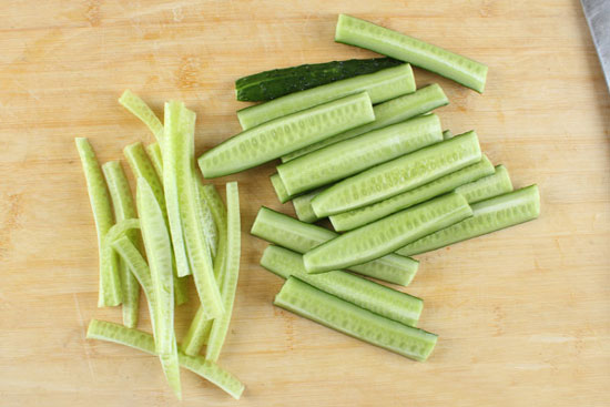 用刀片去中間的軟籽部分切成適度長短的段