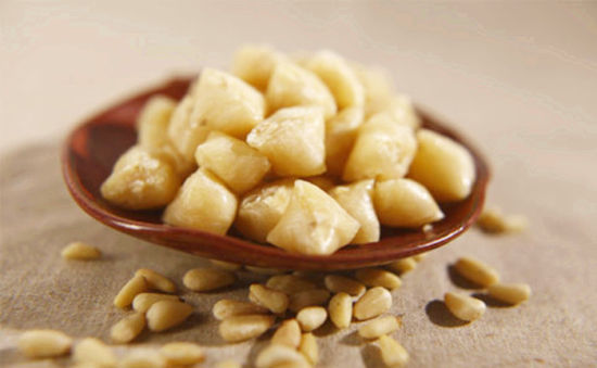 做法:先將白砂糖放入鍋中加少許水,用文火煎熬至粘稠,再加入松子仁,調(diào)勻。然后繼續(xù)煎熬,直至用鏟子挑起成絲狀,不粘手時,?;?,將糖倒在涂有食用油的盤中,待稍涼,將糖切成小塊,即可食用。