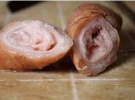剛出鍋的豬蹄又黏又燙,肉不多吃起來卻很軟糯,完全嘗不到濃重的料味,嘴巴里都是肉原始的香,鍋中直接撈出的大腸,用刀一切油水就緩緩流出,外皮脆脆筋筋內(nèi)里卻很香軟。