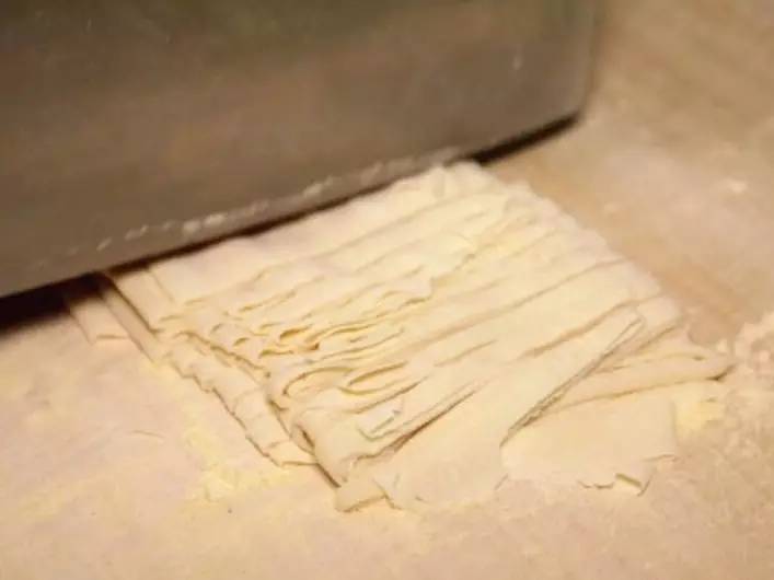 高筋面粉來和面,用搟面杖反復(fù)搟二十多分鐘,直到面餅微薄透光。這樣做出的面條,經(jīng)過煮制后口感才會(huì)筋道軟滑。