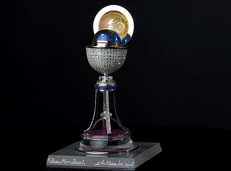 打開“幻影蛋”蛋殼后,可以看到里面裝飾華麗的迷你地球儀。將地球儀頂端提起,里面是用無色水晶雕成的白鴿,棲息在黃金橄欖枝上,還有黃金手工雕刻的“世界和平”字樣。這個(gè)“幻影蛋”是精英工匠歷時(shí)3年方才打造完成的。