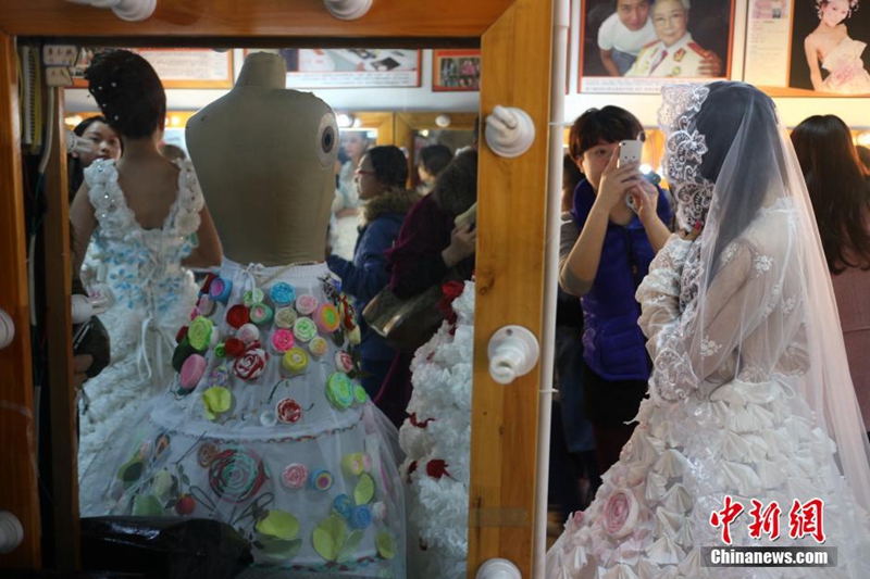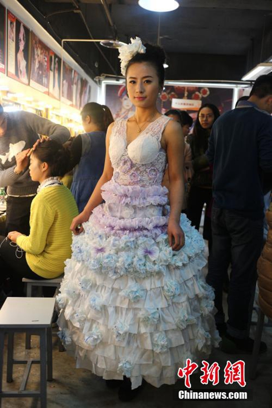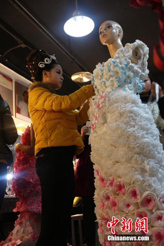 1月12日,成都職業(yè)技術(shù)學(xué)院數(shù)十名大學(xué)生將自己設(shè)計(jì)的期末作品——紙婚紗穿上展示,這些作品都是經(jīng)過數(shù)天時(shí)間手工制作而成,以報(bào)紙、衛(wèi)生紙、成績(jī)單等作為原材料,大學(xué)生在完成個(gè)性化的婚紗定制的同時(shí)還倡行了廢物利用的環(huán)保理念。圖為大學(xué)生穿上自己的紙婚紗作品。 張浪 攝