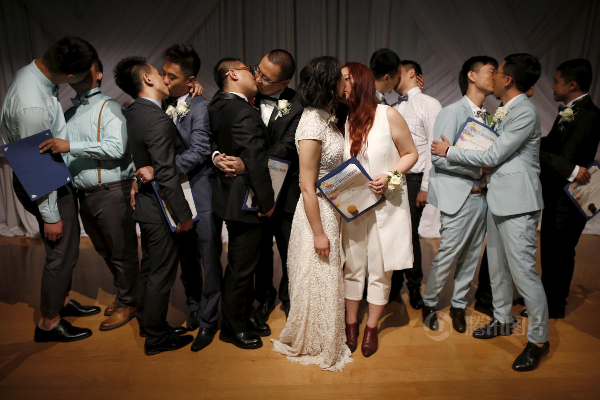 6月9日,美國(guó)加州洛杉磯,七對(duì)來(lái)自中國(guó)的同性戀情侶舉行集體婚禮,婚禮儀式由中國(guó)大陸一家互聯(lián)網(wǎng)巨頭資助。加州是美國(guó)同性戀婚姻合法的30個(gè)州之一,婚禮費(fèi)用均由贊助企業(yè)承擔(dān)。