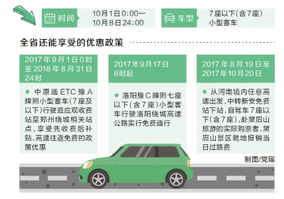 同時(shí),全省還能享受到除高速免費(fèi)以外的其他優(yōu)惠政策:從2017年9月1日0時(shí)至2018年8月31日24時(shí),中原通ETC豫A牌照小型客車(7座及以下)行駛嘉應(yīng)觀收費(fèi)站至鄭州繞城相關(guān)站點(diǎn),享受先收費(fèi)后補(bǔ)貼、高速往返免費(fèi)的政策優(yōu)惠;2017年9月17日8時(shí)起,洛陽(yáng)豫C牌照7座以下(含7座)小型客車行駛洛陽(yáng)繞城高速公路實(shí)行免費(fèi)通行;2017年8月19日至2017年10月20日,從河南境內(nèi)任意高速出發(fā),中轉(zhuǎn)新安縣下站,自駕7座以下(含7座)小型客車赴黛眉山旅游的實(shí)際購(gòu)票者,黛眉山景區(qū)就地報(bào)銷當(dāng)日過(guò)路費(fèi)。
